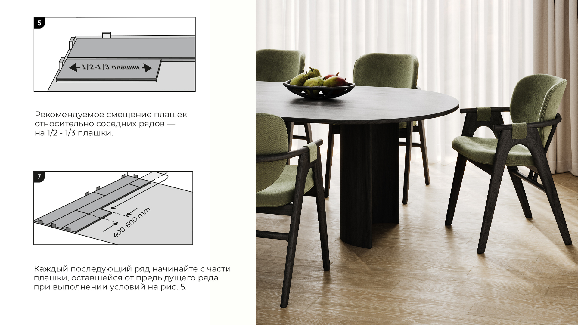 Ещё одно правило, которое поможет при монтаже разнодлинного кварцевого паркета: каждый последующий ряд необходимо начинать с части плашки, оставшейся от предыдущего ряда. Так вы легко сможете соблюдать смещение плашек относительно соседних рядов на ½ или ⅓ доски.