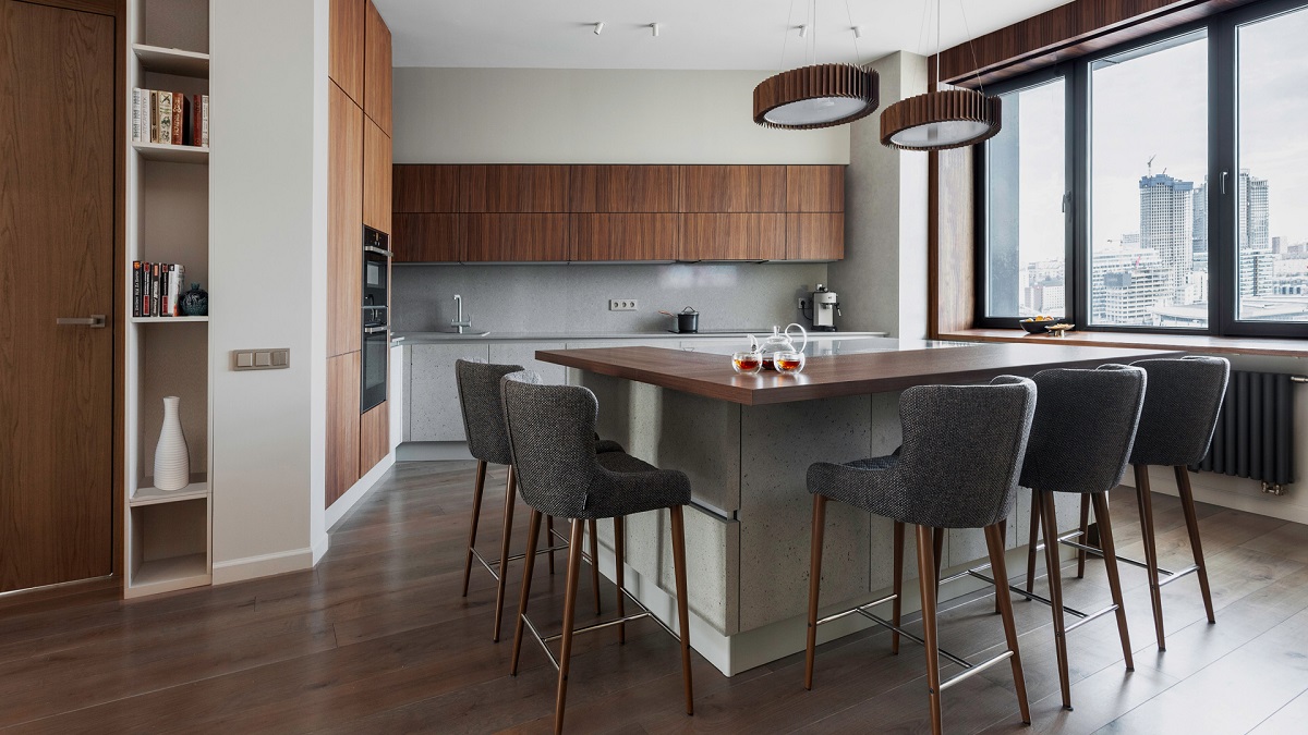 Конструктивные линии, акцент на натуральных ценных породах дерева, принадлежность к трендовому экостилю. Кварцпаркет на полу — прямое отражение стиля и вкуса к жизни владельцев дома.